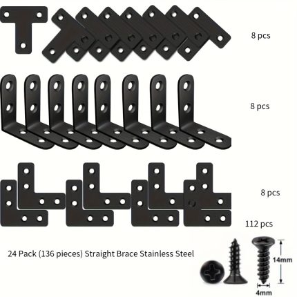 24 Pack (136pcs) Straight Brace Black Flat Brace Straight Corner Braces Straight Brackets Metal Flat Straight Mending Plates with Screws