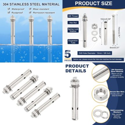 M8 x 70mm 304 Stainless Steel Expansion Bolts 5pcs External Hex Expansion Screw Bolt Sleeve Lengthened for Concrete Drywall Construction Projects Silvery, Drywall Fasteners, Building Materials, Durable Fasteners, Heavyduty Bolts, Corrosionresistant Bolts, Industrialgrade Hardware, Threaded Fasteners, Contractors, Diy Enthusiasts