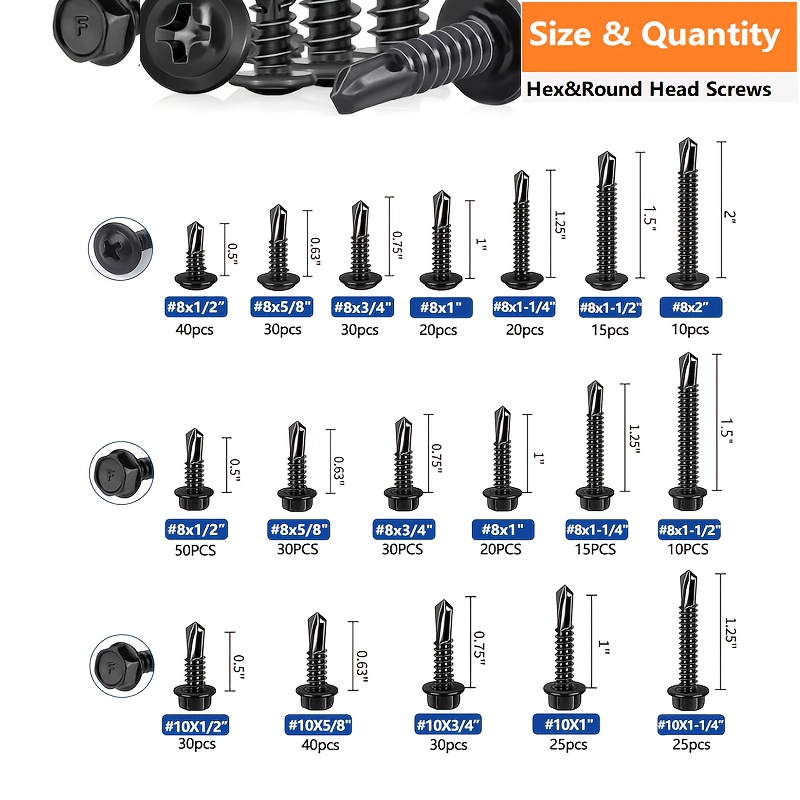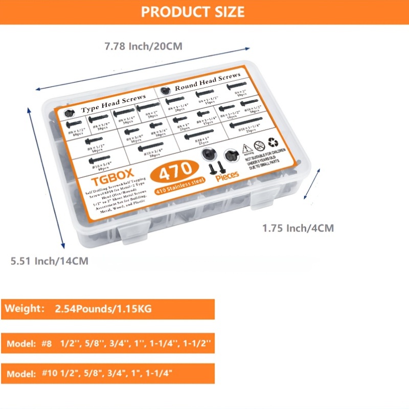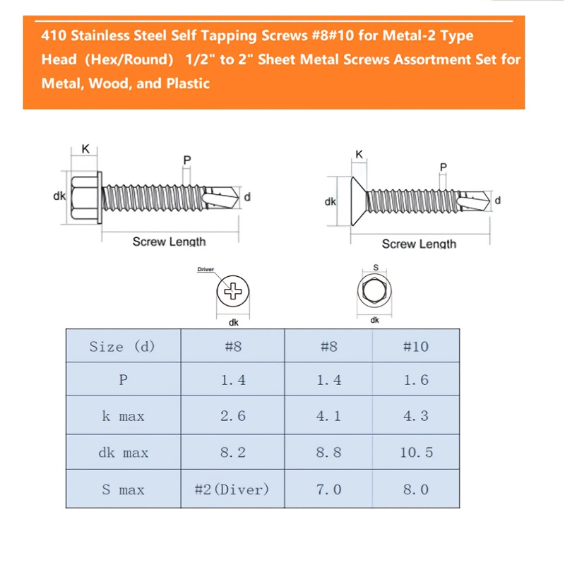 470pcs Tgbox Self Drilling Screws | 410 Stainless Steel Self Tapping Screws #8#10 For Metal-2 Type Head (Hexu002FRound) 1u002F2